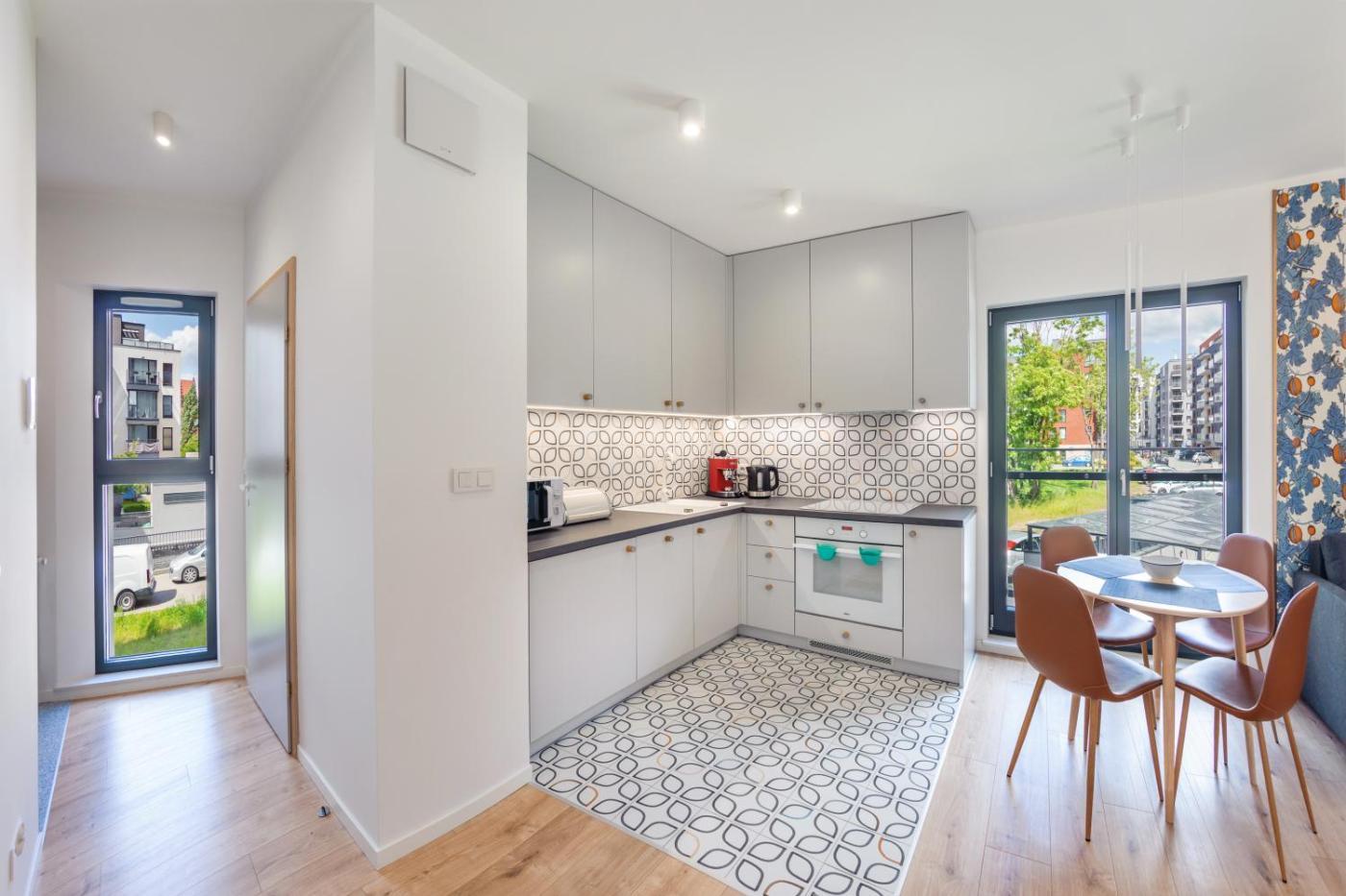 Oferta apartamentu obejmuje sypialnię (1), salon, aneks kuchenny z pełnym wyposażeniem, w tym lodówką i ekspresem do kawy, a także łazienkę (1) z prysznicem oraz suszarką do włosów. W apartamencie zapewniono ręczniki i pościel.
