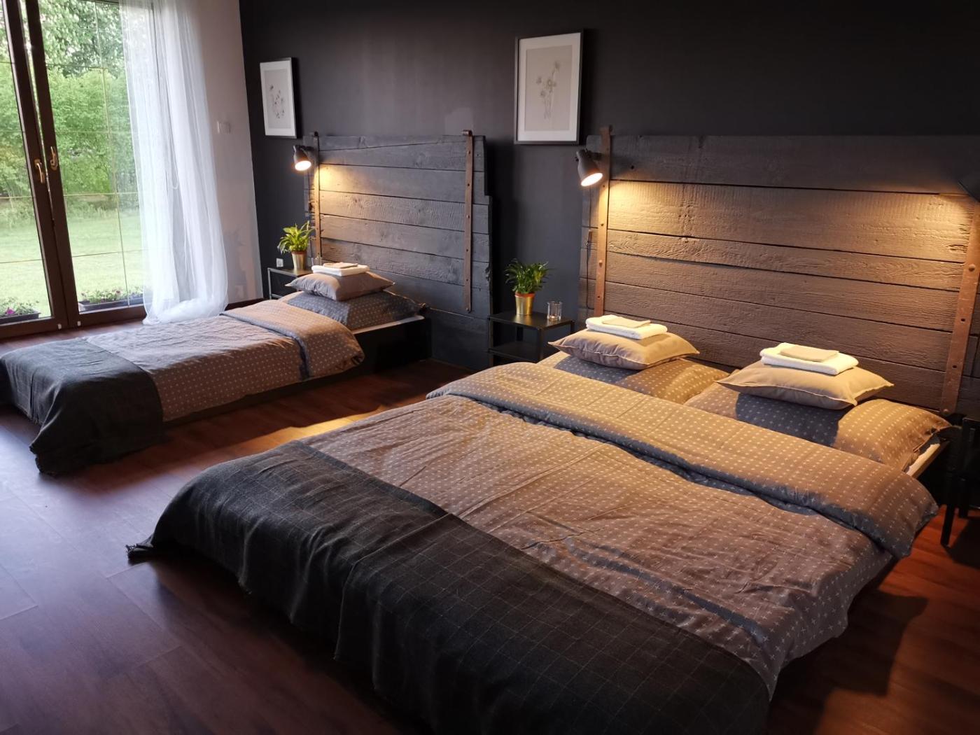 Pokój trzyosobowy z widokiem na ogród. This triple room features a shared bathroom, a wardrobe, heating as well as a terrace. The unit offers 2 beds. Pokój Trzyosobowy - 3 osobowy.